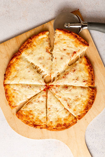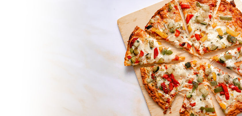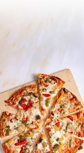 This crust? Cauliflower. Thin, golden, and built to crunch. On top? Roasted zucchini, a rainbow of red, yellow, and green bell peppers, onions, and a zesty tomato sauce that knows how to shine. Finished with three real cheeses that melt into every crevice. It’s not just pizza - it’s peak flavor.