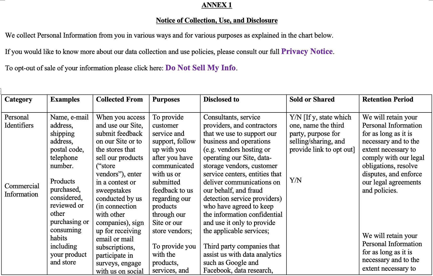 Within the past 12 months, we have collected the categories of personal information about California consumers as described in Annex 1 to this Notice.